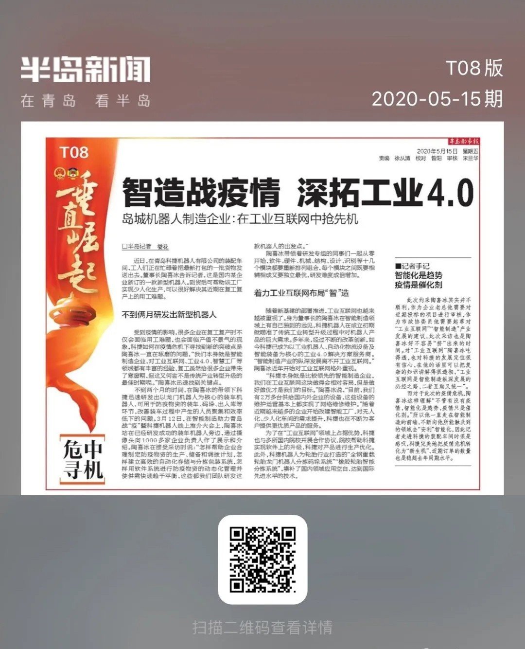 3月12日,在智能制造助力青島戰(zhàn)“疫”暨科捷機(jī)器人線上推介大會(huì)上,陶喜冰站在已經(jīng)研發(fā)成功的裝車機(jī)器人旁邊,通過(guò)攝像頭向1000多家企業(yè)負(fù)責(zé)人作了展示和介紹。陶喜冰在接受采訪時(shí)說(shuō):“怎樣幫助企業(yè)合理制定防疫物資的生產(chǎn)、儲(chǔ)備和調(diào)撥計(jì)劃,怎樣建立高效的自動(dòng)化存儲(chǔ)與分揀包裝系統(tǒng),怎樣用軟件系統(tǒng)進(jìn)行防疫物資的動(dòng)態(tài)化管理并使供需快速趨于平衡,這些都我們團(tuán)隊(duì)研發(fā)這款機(jī)器人的出發(fā)點(diǎn)。”